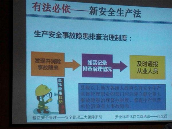 本次培訓(xùn)由著名的安全管理咨詢師張全磊老師主講,培訓(xùn)從安全第一(強(qiáng)化安全意識杜絕習(xí)慣違章)、預(yù)防為主(做好危害辨析消除現(xiàn)場隱患)、綜合治理(落實安全標(biāo)準(zhǔn)化安全管理體系化)三大方面展開。
