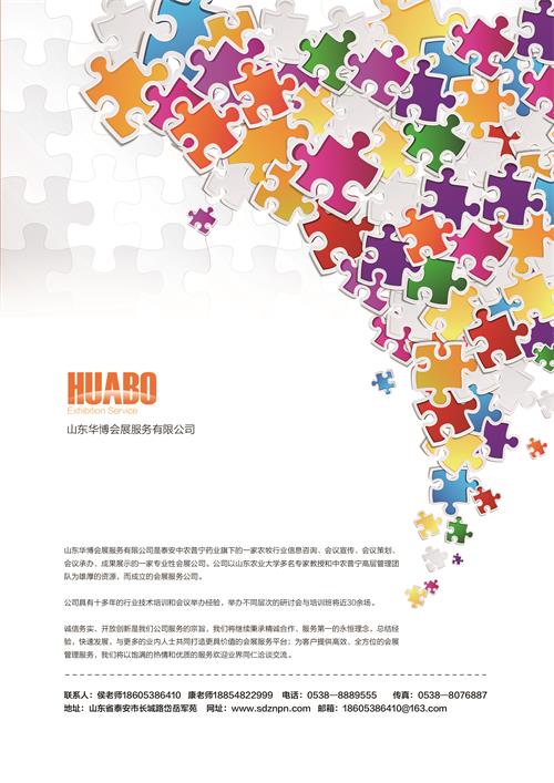 山東華博會展服務有限公司是泰安中農(nóng)普寧藥業(yè)旗下的一家農(nóng)牧行業(yè)信息咨詢、會議宣傳、會議策劃、會議承辦、成果展示的一家專業(yè)性會展公司。公司以山東農(nóng)業(yè)大學多名專家教授和中農(nóng)普寧高層管理團隊為雄厚的資源,而成立的會展服務公司。